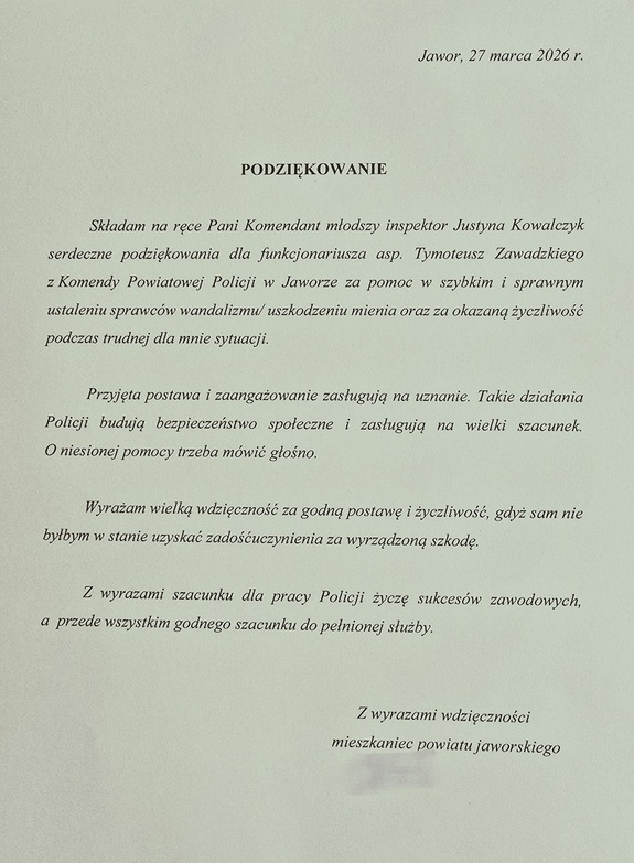 Do Komendy Powiatowej Policji w Jaworze wpłynęło podziękowanie od mieszkańca powiatu jaworskiego, który wyraził wdzięczność za profesjonalną pomoc udzieloną przez jednego z funkcjonariuszy. Autor listu docenił szybkie i skuteczne działania policjanta oraz jego życzliwe podejście w trudnej dla niego sytuacji.