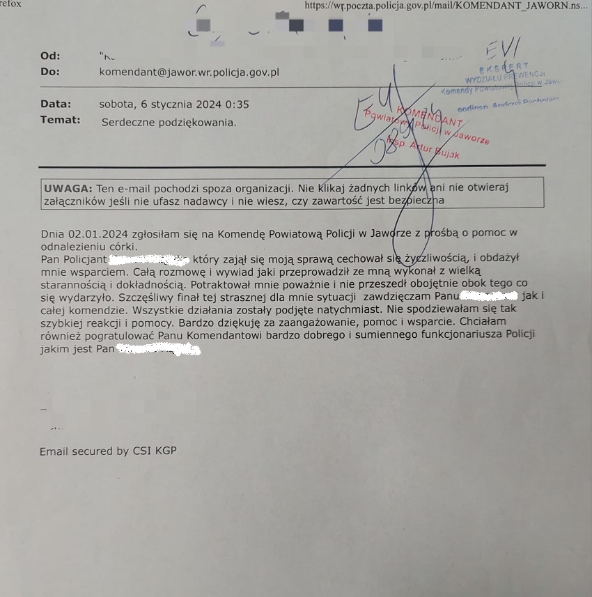 Na ręce Komendanta Powiatowego Policji w Jaworze insp. Artura Bujaka oraz funkcjonariusza wydziału kryminalnego wpłynęły podziękowania od jednej z mieszkanek naszego powiatu, która postanowiła docenić profesjonalizm, życzliwość oraz zaangażowanie policjanta w poszukiwaniu jej zaginionej córki.