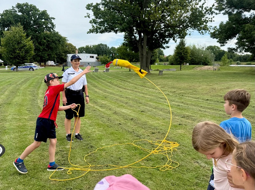 Na koniec spotkania uczestnicy półkolonii nie tylko otrzymali materiały profilaktyczne dotyczące bezpiecznego wypoczynku nad wodą, ale przede wszystkim mogli dowiedzieć się, co to jest i do czego służby rzutka ratownicza. Każde dziecko mogło samodzielnie wypróbować tego typu sprzęt ratowniczy, który jest na wyposażeniu wszystkich radiowozu jaworskiej jednostki.