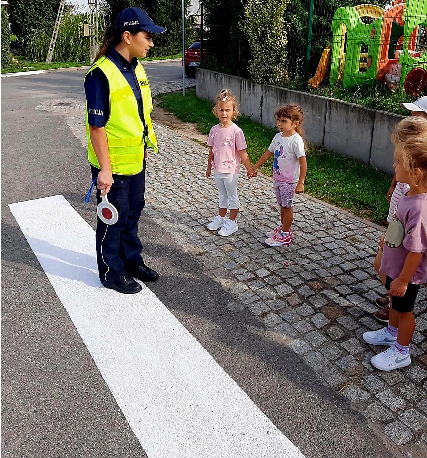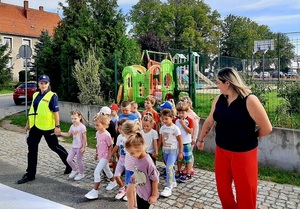 Następnie uczniowie mogli na chwilę oderwać się od ławek szkolnych, aby w praktyce odrobić lekcje z ruchu drogowego. Policjantka wraz z dziećmi udała się w rejon przejścia dla pieszych, by przećwiczyć prawidłowe przechodzenie przez jezdnię.