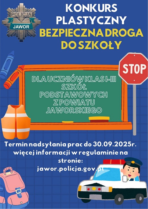 „Bezpieczna droga do szkoły” – taki tytuł nosi konkurs plastyczny zorganizowany przez Komendę Powiatową Policji w Jaworze. Konkurs adresowany jest do uczniów klas I-III szkół podstawowych z terenu powiatu jaworskiego. Zachęcamy wszystkich do wzięcia udziału. Czekają na Was ciekawe nagrody! Termin dostarczenia prac mija jutro!