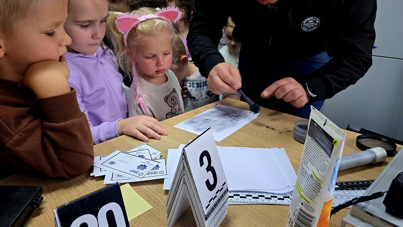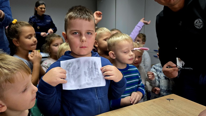 Największe wrażenie zrobiły jednak zajęcia u technika kryminalistyki. Dzieci mogły zobaczyć, jak wygląda praca policyjnego technika i dowiedziały się, w jaki sposób zabezpiecza się ślady. Każde dziecko otrzymało na pamiątkę odbitkę swoich dłoni – zupełnie jak prawdziwy trop!