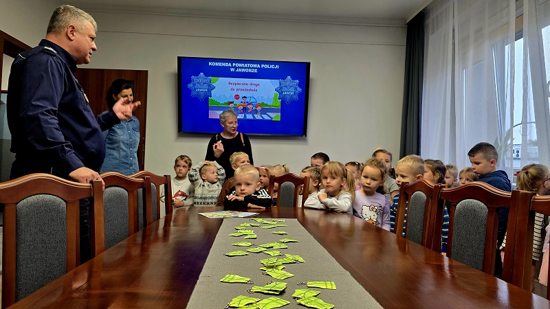 Dzieci spotkały się także z Komendantem jaworskiej jednostki, który przyjął ich w swoim gabinecie. Każdy z przedszkolaków otrzymał od niego odblask oraz słodką niespodziankę – lizaka.