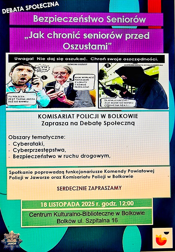 Zapraszamy zainteresowanych mieszkańców miasta i gminy Bolków oraz mieszkańców powiatu jaworskiego na debatę pn.„ Bezpieczeństwo Seniorów. Jak chronić seniorów przed oszustami”, która odbędzie się już jutro, czyli 18 listopada 2025 roku o godz. 12:00 w Centrum Kulturalno-Bibliotecznym w Bolkowie.
