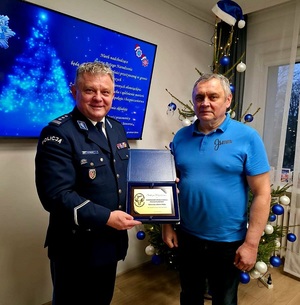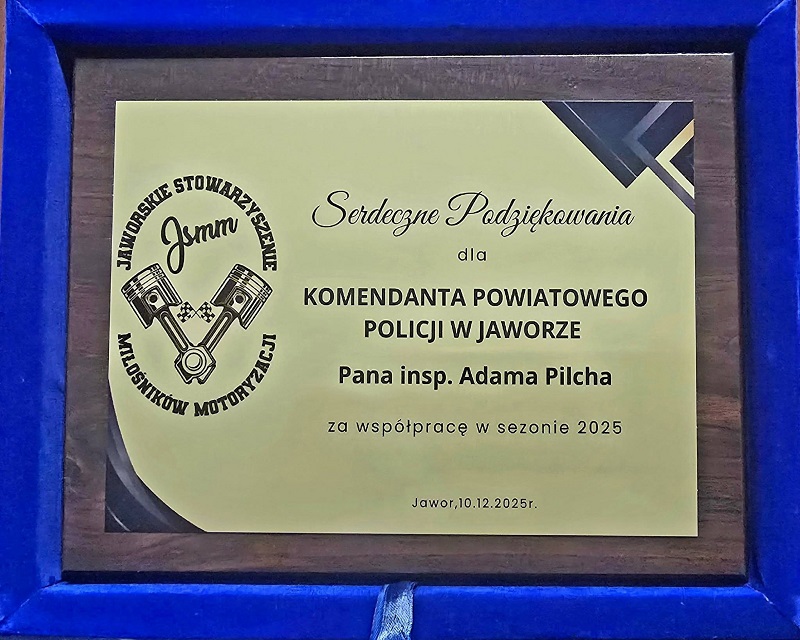 Wczoraj, Komendanta Powiatowego Policji w Jaworze insp. Adama Jacka Pilcha odwiedził Pan Andrzej Giera - Prezes Jaworskiego Stowarzyszenia Miłośników Motoryzacji, który przekazał pamiątkową tabliczkę jako wyraz podziękowania za całoroczną współpracę na rzecz bezpieczeństwa mieszkańców Jawora oraz powiatu jaworskiego.