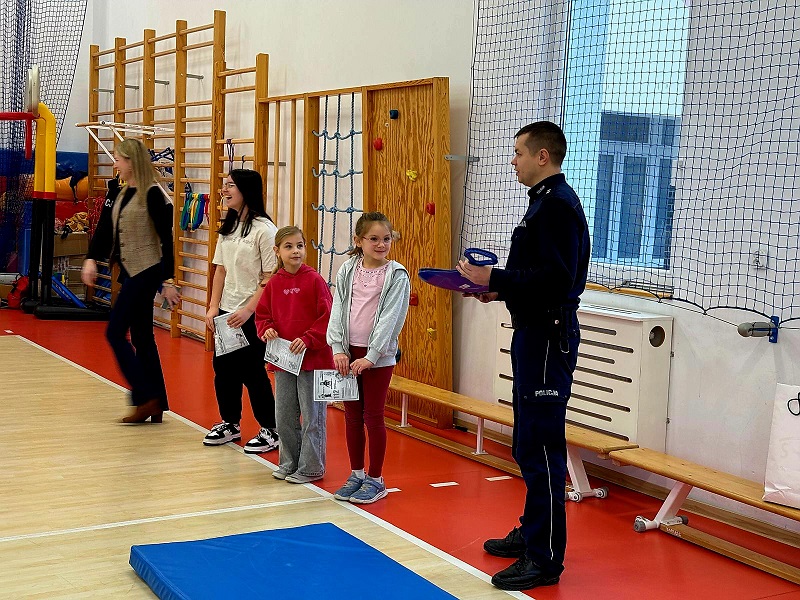 Najbardziej aktywne dzieci, które chętnie odpowiadały na pytania, otrzymały od mundurowych ślizgacze do zabaw na śniegu.