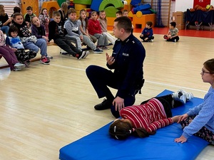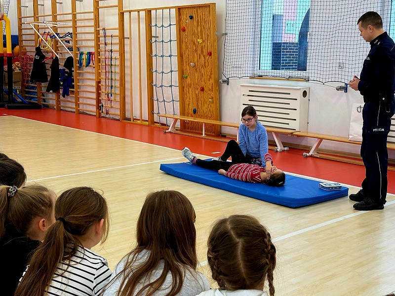 Ważnym elementem zajęć był pokaz udzielania pierwszej pomocy przedmedycznej. Uczniowie mogli zobaczyć, jak prawidłowo reagować w sytuacji zagrożenia życia oraz jak działa przenośne urządzenie AED, służące do przywracania czynności życiowych.