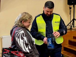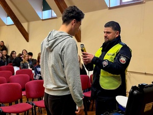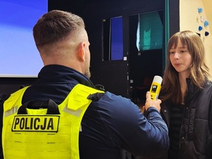 Swoje wyposażenie zaprezentowali także policjanci z Wydziału Ruchu Drogowego. Funkcjonariusze pokazali między innymi miernik prędkości oraz urządzenia wykorzystywane do badania stanu trzeźwości – AlcoBlow. Uczniowie mogli zobaczyć, jak wygląda takie badanie w praktyce, a także samodzielnie sprawdzić działanie sprzętu.